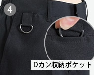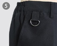 仕 様:スナップボタン、後ろウエスト脇ゴム、左右後ろポケット、Dカン